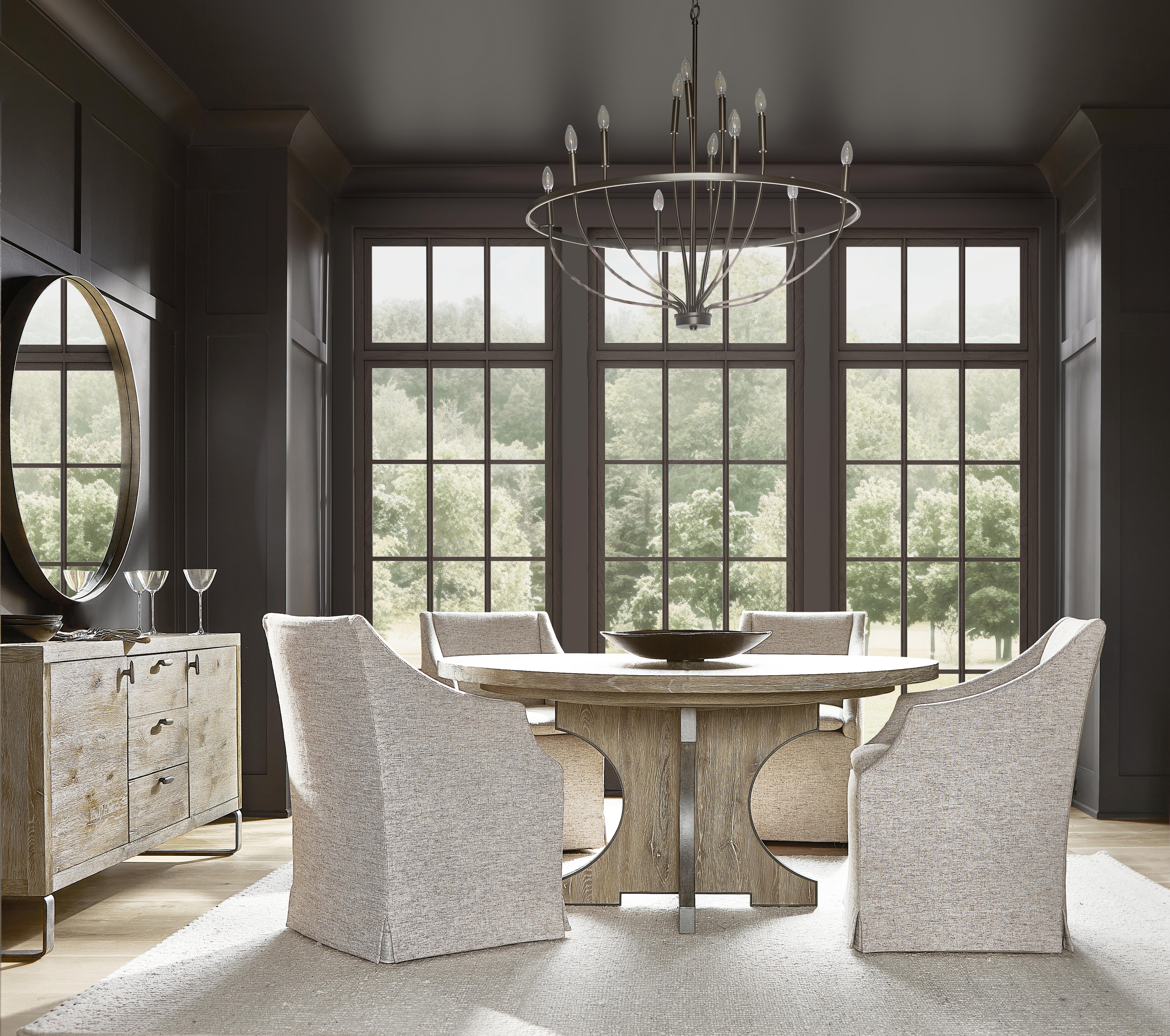 We recommend a "layered" strategy: use a structured Hooker sideboard to anchor the room, then ground the space with the organic warmth of a Four Hands wood table or woven chairs. -