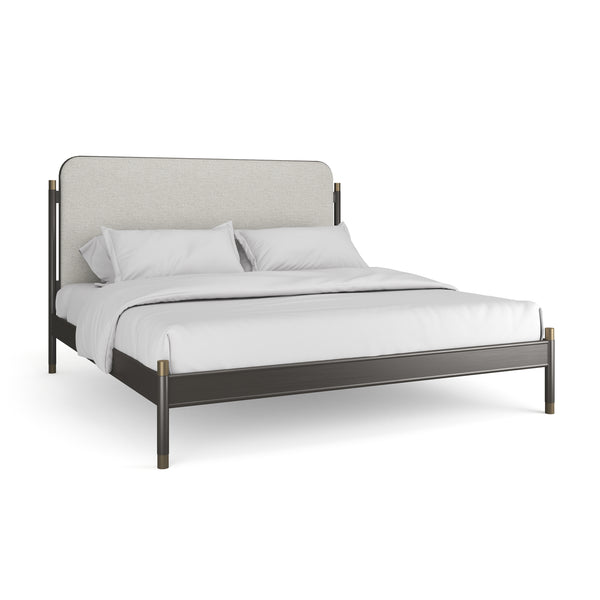 Metal campaign beds of the past get a new spin with this attractive mix of metal and upholstery in contrasting colors and textured finishes. Ivory linen-blend micro-ribbed fabric is applied to the headboard, footboard and side rails. Designed to be able to float in a room, the headboard is upholstered on both sides and framed in a Brushed Deep Bronze metal frame. Headboard trim and low finials glisten in Champagne Gold. Upholstered headboard, footboard and siderails.