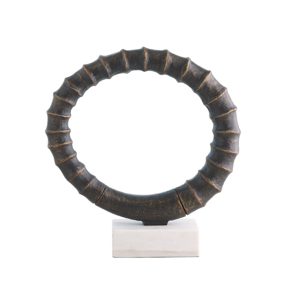The Infinity Horn Sculpture is crafted from cast iron with a hand-painted silver, bronze leaf and gold finish and elegantly rests on a black marble base.