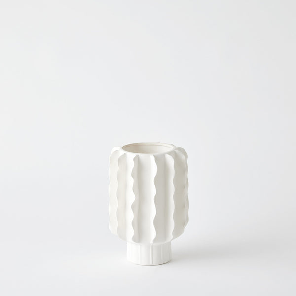 The Frilled Vases are exquisite ceramic pieces in a matte white finish featuring delicate hand-formed ruffle designs. Each piece is a stunning work of art, adding elegance and charm to any space with its beautiful craftsmanship and unique details.