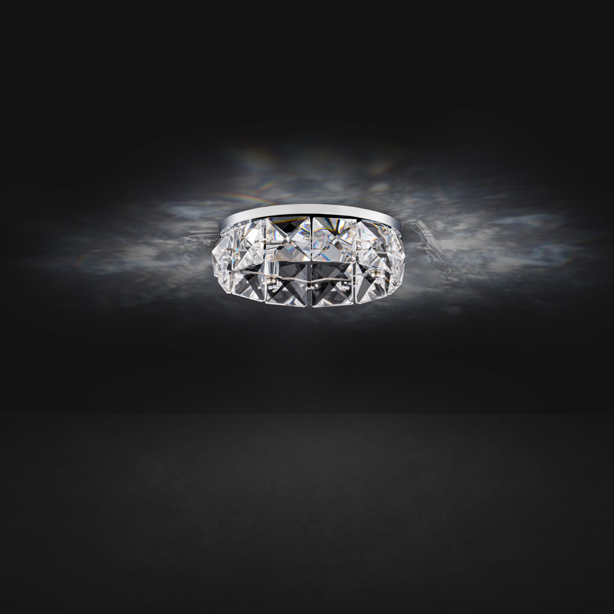LED light plays with a circle of sparkling Schonbek Radiance Crystal squares, animating ceilings with multidimensional reflections while delivering even illumination.