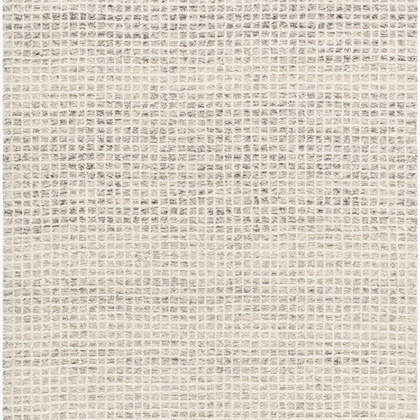 - This handmade rug features a captivating design with gray to black shades in random streaks, beautifully contrasted by a solid white grid that adds depth and texture